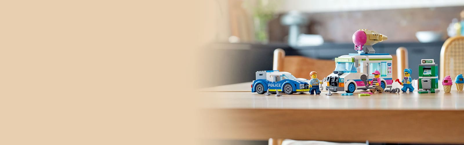 A 317-piece set with an ice cream truck, police car, ATM setting and 3 minifigures, including 2 LEGO® City TV characters.
