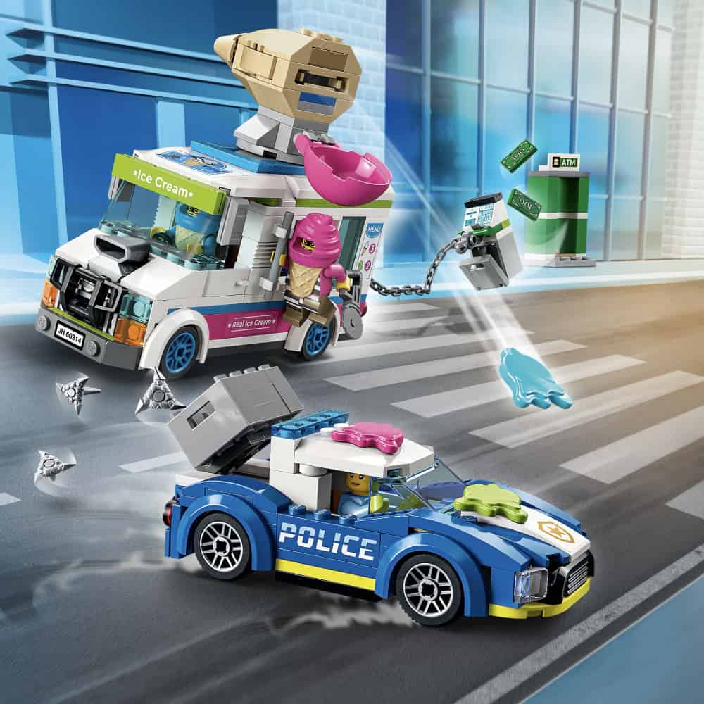 A crooks’ ice cream truck, a cool police interceptor and 2 LEGO® City TV characters set the scene for action-packed play.