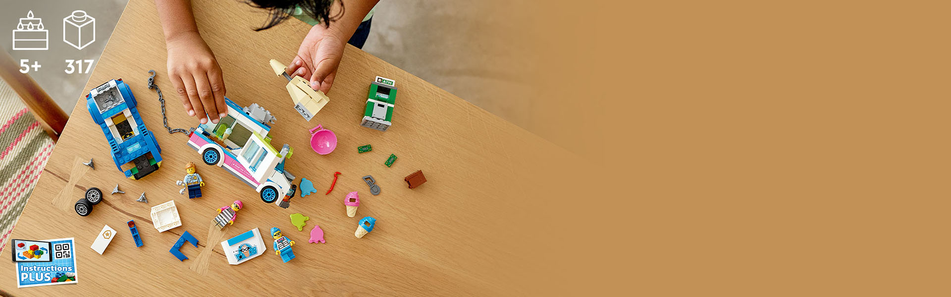 A 317-piece set with an ice cream truck, police car, ATM setting and 3 minifigures, including 2 LEGO® City TV characters.